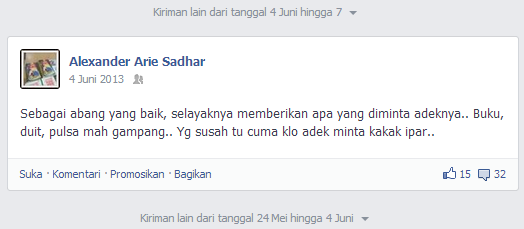 Apresiasi saya nilai dari jumlah dan bobot komen, berikut juga jempolnya. Saya berusaha untuk memberikan hiburan dalam setiap permenungan. Tidak selalu mesti lucu, tapi setidaknya saya bisa kisahkan dengan agak lucu. Kadang-kadang pengalaman yang nggak lucu bisa berubah lucu ketika konteksnya disesuaikan. Jadi, sekali lagi, kalaulah saya update status yang semacam galau bercinta, dll, percayalah bahwa itu belum tentu sebenar-benarnya isi hati saya. Dan kalau masih nggak percaya nih, saya sudah melakukannya pada tahun 2012.