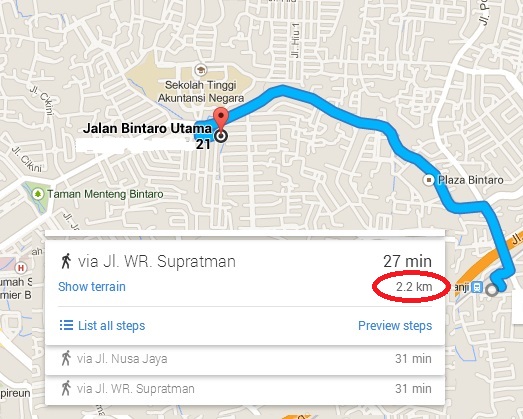 Wah, dihitung-hitung ternyata mahal juga ya. Untuk jarak 2,2 kilometer saya harus bayar 10 ribu rupiah. Sekitar 4000-an per kilometernya. Lebih mahal dari Cikarang, padahal dulunya saya pikir di Cikarang itu sudah mahal. Eh, ternyata di Bintaro lebih mahal. #akurapopo