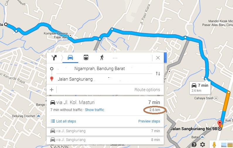 Satu tempat yang tarifnya lumayan bersahabat dengan kantong adalah Cimahi. Dengan jalan yang lumayan mirip kampung halaman Ninja Hattori, tarif yang dikenakan hanya 7000 saja. Itu juga pacar bilang kalau aslinya 5000. Kalau semacam ini sih saya nggak berasa dikadalin. Hitung-hitung sekitar hampir 3000 per kilometer. Masuk akal dan masuk bujet.