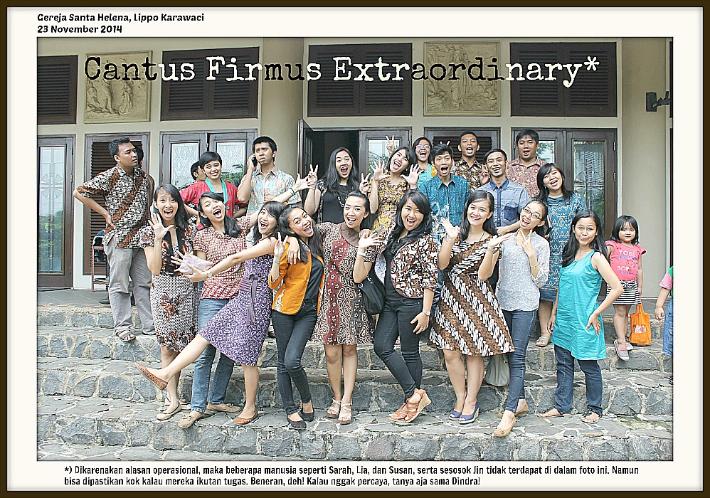 Yup, kisah soleh pertama hari ini adalah bernyanyi bersama anggota PSM Cantus Firmus yang sudah tidak Mahasiswa lagi, di Santa Helena, Lippo Karawaci. Sebenarnya, sebagai umat Katolik pada umumnya, cuma nyanyi di misa itu sangat biasa. Lagu-lagunya juga pasti biasa. Bahkan seperti yang pernah saya tulis sebelumnya di blog Catatan Umat Biasa, untuk bernyanyi pada misa, banyak koor yang latihan alakadarnya, bernyanyi alakadarnya, dan segala hal yang sungguh alakadarnya.