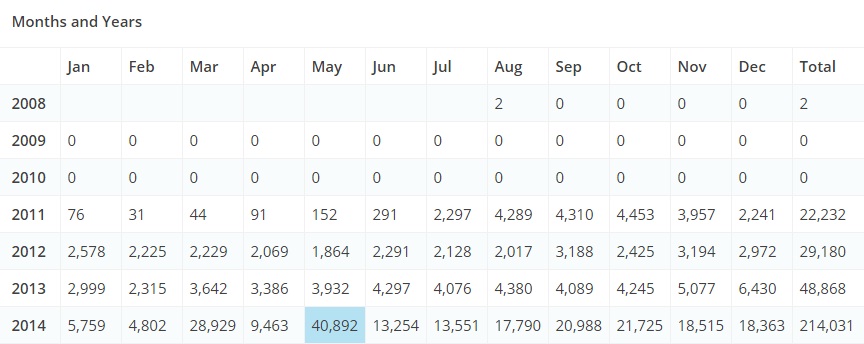 Kalau melihat flow-nya tentu tampak keren bagi saya. 2011 melonjak dari 200-an ke 2000-an via bantuan artikel tentang Shaun The Sheep. Lalu bertahan dan merangkak ke 29 ribu setahun di 2012, lantas sedikit pengaruh dari buku saya OOM ALFA muncul juga dengan kenaikan nyaris 2 kali lipat di 2013. Dan di 2014 naik empat kali lipat.