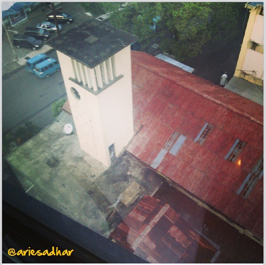 Saya mengintip dari jendela, tapi tidak melihat ada gereja di sebelah. Maka opsinya adalah sebelah lain dari hotel. Maka saya bergegas mencari jendela untuk bisa mengintip, dan benar saja, gereja itu ternyata bisa dilihat dengan sangat jelas.