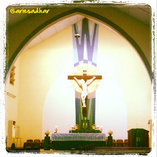 Nah, waktu di Kendari, saya sempat googling mencari gereja, dan kiranya berjarak kurang lebih 1,2 kilometer. Saya keder, meski jarak itu sebenarnya nggak jauh-jauh amat. Pas di Palembang, saya sih tahu gerejanya, cuma sudah terlalu lelah ketika bangun pagi. *alasan*. Karena ini hanya dinas singkat, plus dari tadi lihat banyak gereja, pikir saya, “masak sih nggak ada satu aja gereja yang dekat?”