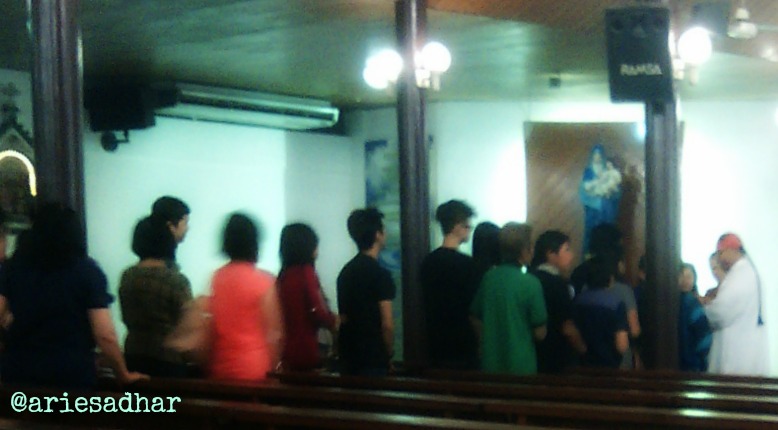 Pembagian komuni tidak menggunakan baris tengah, namun membuat baris di masing-masing sisi. Depan satu, belakang satu. Karena kebetulan ada pilar, jadi barisan antrean komuni juga harus ketatap pilar dalam beberapa langkah. Nggak apa-apa, daripada ketatap kaki langit?
