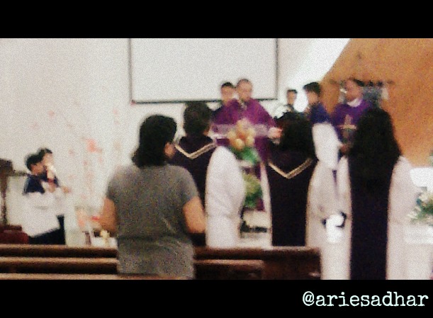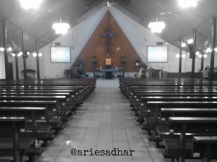 Oya, entah kebetulan apa memang selalu begini, misa yang saya hadiri terbilang sepi. Bagian depan praktis kosong, sebelah saya juga kosong–meski saya berharap ada gadis remaja muda belia nan cantik jelita yang ada disana. Tiga meter dari saya ada remaja muda belia nan cantik jelita, sih, tapi persis diantara kami ada neneknya. Okesip. Ini juga tren unik Gereja Katolik, sudah jelas depannya kosong, kenapa nggak diisi duluan ya?