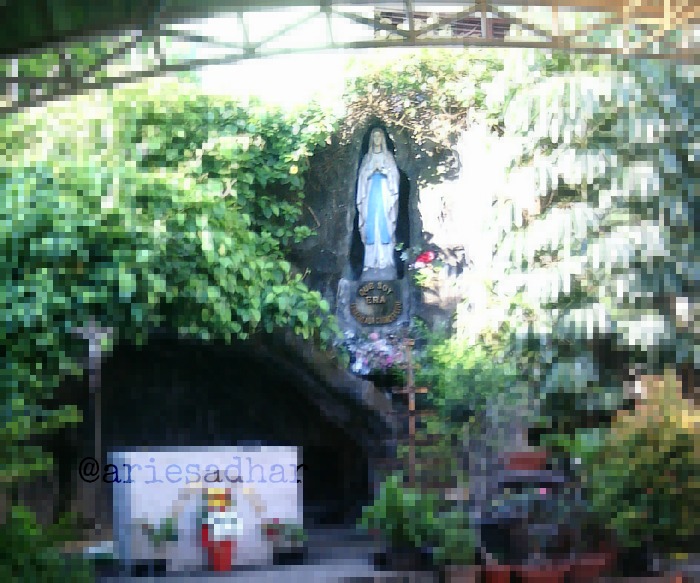 Dari luar, apalagi karena pagarnya kayaknya kecil, maka Gereja ini tampaknya kecil. Begitu masuk, langsung tampak Gua Maria. Ada banyak kursi di depan bangunan Gua. Adapun Patung Bunda Maria berada di tempat yang agak tinggi. Ketika saya datang, langit masih gelap, pun Gereja masih dipel. Sungguhpun saya memang terlalu rajin–sekali-kalinya. Saya lalu agak lama di depan Patung Bunda Maria yang sebenarnya tidak terlalu besar itu. Hanya bangunan Guanya memang besar. Ngomong-ngomong, sudah lama saya tidak bersyahdu ria di depan Bunda Maria pada pagi buta. Cukuplah sebagai pelepas rindu.