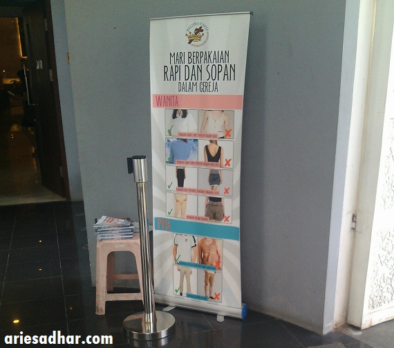 Sesudah ketemu Bunda Maria, saya masuk ke dalam Gereja. Sebelum pintu masuk ada sebuah tempat bundar dan di tengah-tengahnya ada air suci. Air suci ditempatkan di wadah besar, persis di tengah-tengah, beberapa meter dari pintu masuk. Saya kemudian melangkah mantap ke pintu masuk yang tampak kecil itu setelah sempat melihat banner himbauan berpakaian rapi dan pantas di Gereja. Sip juga.