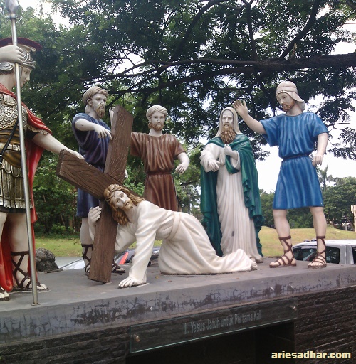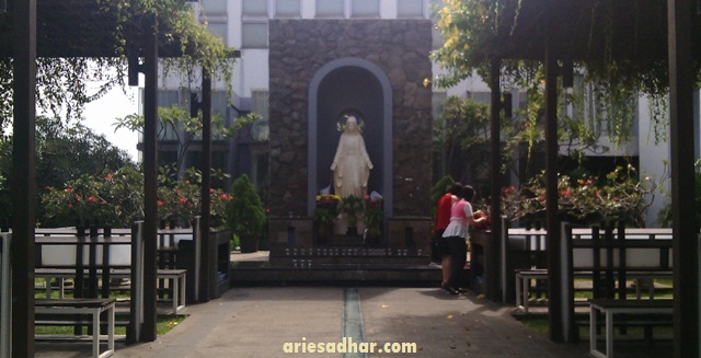 Karena masih 1 jam, saya kemudian mlipir ke Gua Maria. Ah, disini tempatnya kece sekali! Nuansa yang dibangun sebagai peziarahan Bunda Maria begitu terasa, apalagi dengan dukungan tempat doa yang sejuk. Jakarta Utara memang panas, lha belakang Gereja ini adalah hutan bakau, namun dengan bantuan peneduh nan kece, nuansa doa diperoleh dengan mantap. Kalaulah ada yang mengganggu adalah ketika ada sebuah Brio yang dikendarai ibu-ibu harus parkir susah payah sehingga arahan tukang parkir sampai ke telinga orang yang sedang berdoa.