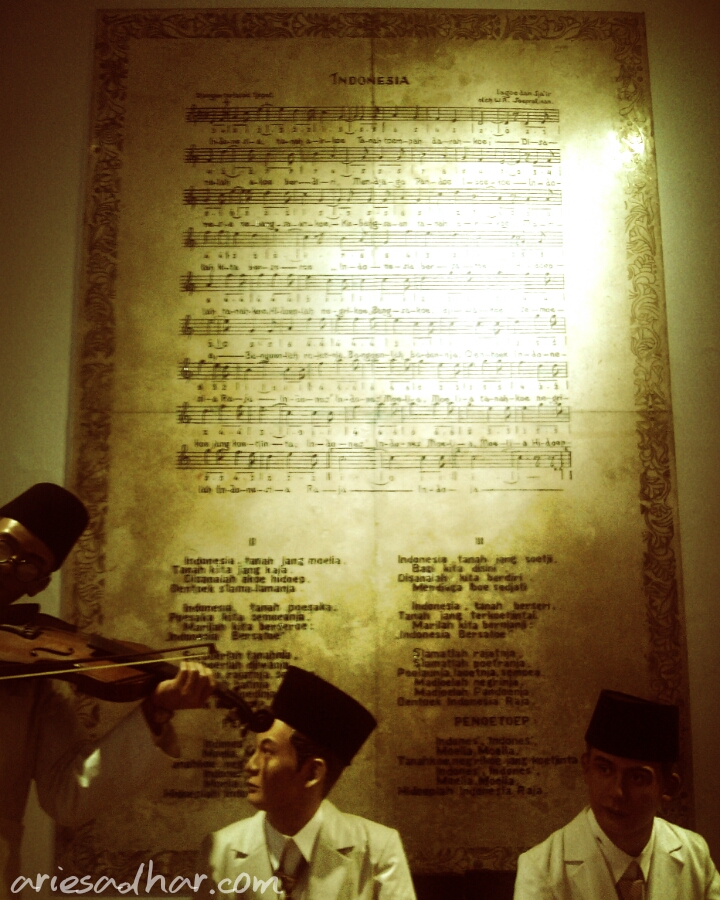 Museum ini sebenarnya kecil. Jujur saja. Ya, kan dulunya juga rumah tinggal. Begitu masuk dari pintu tengah–tentunya setelah membayar 2000 perak–kita akan menemukan tiga orang yang sedang membaca buku berbahasa Belanda. Alurnya kemudian adalah belok kiri, disitu ada patung lainnya kali ini dengan radio lawas. Tenang, untuk informasi ada keterangan dan foto-foto di dinding yang bisa menjelaskan apa yang dimaksud. Inti dari museum ini ada di bagian berikutnya ketika sederet tokoh sedang mendengarkan WR Supratman yang sedang memainkan biola. Di dinding kita bisa melihat sebesar-besarnya dan seasli-aslinya Sumpah Pemuda dan lagu Indonesia Raya, plus suasana Sumpah Pemuda ketika semua pemuda bersorak. Di bagian lain ada satu ruang khusus yang membahas WR Supratman karena foto di dinding menampilkan bahwa pria yang dikabarkan jomblo sampai akhir hayatnya itu adalah anak band! Dan tenang saja, biola yang bersejarah itu dipajang di tengah-tengah ruangan.