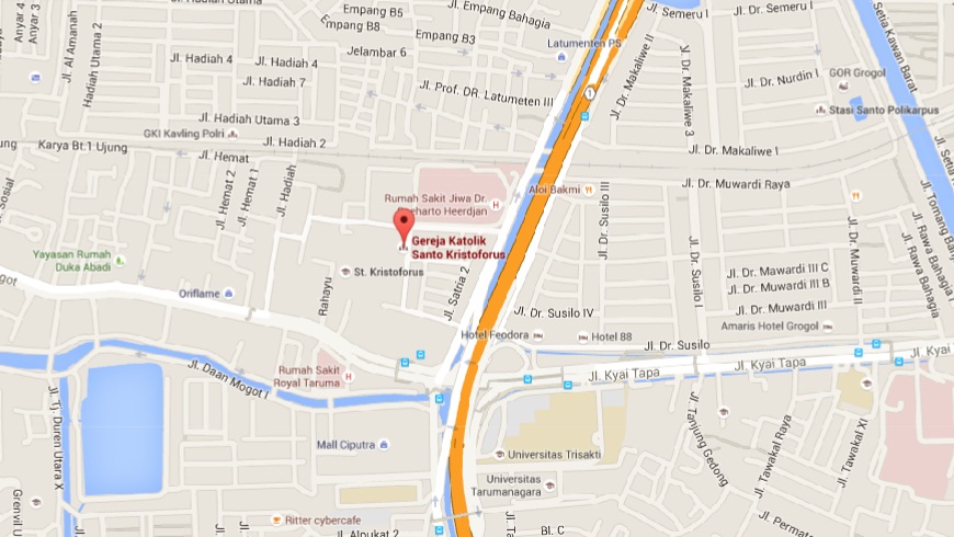 Untuk bisa mencapai Gereja Santo Kristoforus Grogol ini cukup mudah. Cara pertama bisa menggunakan TransJakarta untuk turun di Halte Jelambar, atau juga dikenal dengan Citraland. Dari Halte Jelambar kita berjalan ke arah SPBU, kemudian menyusuri trotoar ke arah Barat, nanti kalau ketemu jalan kecil ke kiri masuk saja, lalu terus dan di ujung jalan belok kiri. Kalau melihat ada plang ATM Mandiri, nah disitulah tempatnya. Satu kompleks dengan sekolahan, gitu. Atau bisa juga dari Stasiun Grogol, berjalannya ke arah timur dan cari saja petunjuk ke sekolah Kristoforus. Nanti akan ketemu ATM Mandiri yang sama. Ngomong-ngomong, yang namanya Grogol ini pasti banjir karena nggak jauh-jauh dari Citraland, Trisakti, dan Tarumanegara yang memang langganan menggenang. Beberapa berita juga menyebut bahwa Gereja Grogol ini beberapa kali kelelep.