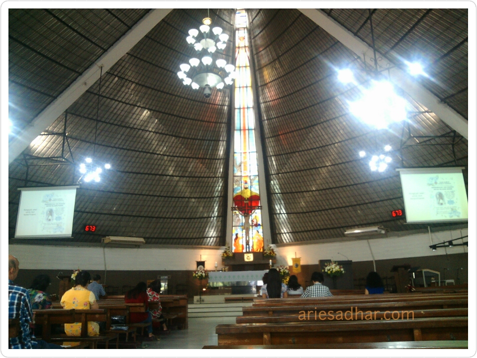 wpid-photogrid_1438524608287.jpgKalau melihat struktur Gerejanya, saya seperti memadupadankan berbagai Gereja yang ada di KAJ, utamanya di Barat. Model kursinya agak-agak bernuansa Kemakmuran, termasuk juga altarnya. Namun mirip-mirip Kedoya juga kalau dilihat-lihat lagi. Terus kalau saya lihat-lihat lagi ada mirip-mirip dengan Jalan Malang juga dari sisi altar yang menjulang tinggi. Ya, ini karena dulu-duluan saya perginya sih. Siapa benchmark siapa, itu kan saya nggak tahu.