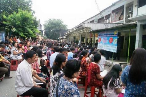 Mungkin menjadi umat Paroki Santa Clara berarti harus bersiap misa di bawah lindungan langit belaka. Tapi lucunya, ketika saya di kapel itu, masih banyak tempat kosong di bagian dalam atawa depan, tetapi ketika saya melihat ke belakang, pengguna kursi plastik luber sampai jauh, semacam Bengawan Oslo, eh, Solo. Parkir mobil atau sepeda motor tentu jangan bandingkan dengan Mangga Besar yang sirkulasinya optimal, apalagi dengan Bojong Indah yang luas halamannya. Ada lapangan bola yang bisa dan biasa digunakan untuk parkir. Jangan pula ngimpi ada tempat parkir beratap semisal di Paskalis atau Matraman. Langit adalah atap ketika misa, maka langit adalah atap ketika parkir sepeda motor.