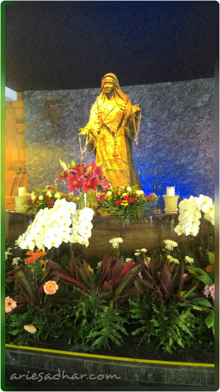 Nah, untuk Gereja Kristus Raja ini boleh dibilang nggak ada halaman sama sekali, jadi Bunda Maria terletak di bawah, di lantai 1 dan kurang lebih tepat di bawah salib Yesus. Kalau saya pengen menjuluki, ini adalah Bunda Maria di parkiran. Agak berbeda dengan Bunda Maria di beberapa Gereja lain yang saya sebut sebagai Bunda Maria di keramaian. Patung Bunda Maria di Kristus Raja ini bagus sekali, termasuk tempat lilin adalah air. Yes, diapungkan di air yang ditampung dan lilin itu akan mengelilingi Bunda Maria. Cool!