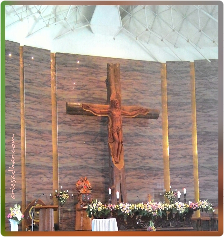 Altar di Gereja ini sungguh wah dan uwow, bahkan jika dibandingkan dengan Gereja-Gereja lain yang umatnya lebih banyak. Mungkin karena baru sekitar tiga tahun dibangun ulang. Dulunya memang Gereja ini selalu kebanjiran–begitu menurut pengakuan ketika ngomong-ngomong di Cikarang. Dengan pembangunan baru ini, sistem drainase juga ikut dibenahi. Maka, selain menuju parkiran menanjak, Gerejanya juga terletak di lantai 2. Oh, dan Gereja ini sangat ramah difabel dan ibu-ibu, lho.
