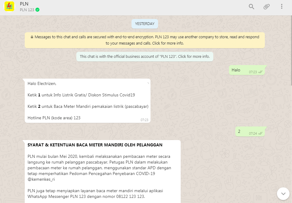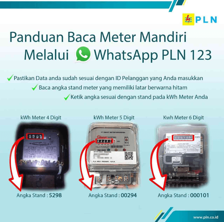 PLN juga tetap menyiapkan layanan baca meter mandiri melalui aplikasi WhatsApp Messenger PLN 123 dengan nomor 08122 123 123.