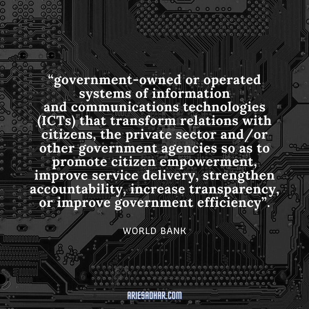 Sebelum lebih lanjut mendalami digitalisasi, mari kita bahas sejenak soal e-Government. Sederhananya, electronic government alias e-Government alias lagi e-Gov merupakan penggunaan teknologi informasi oleh institusi di pemerintahan yang mampu mengubah relasi dengan warga negara, dunia usaha, hingga bidang pemerintahan lainnya. Kurang lebih begitu kalau menurut World Bank.