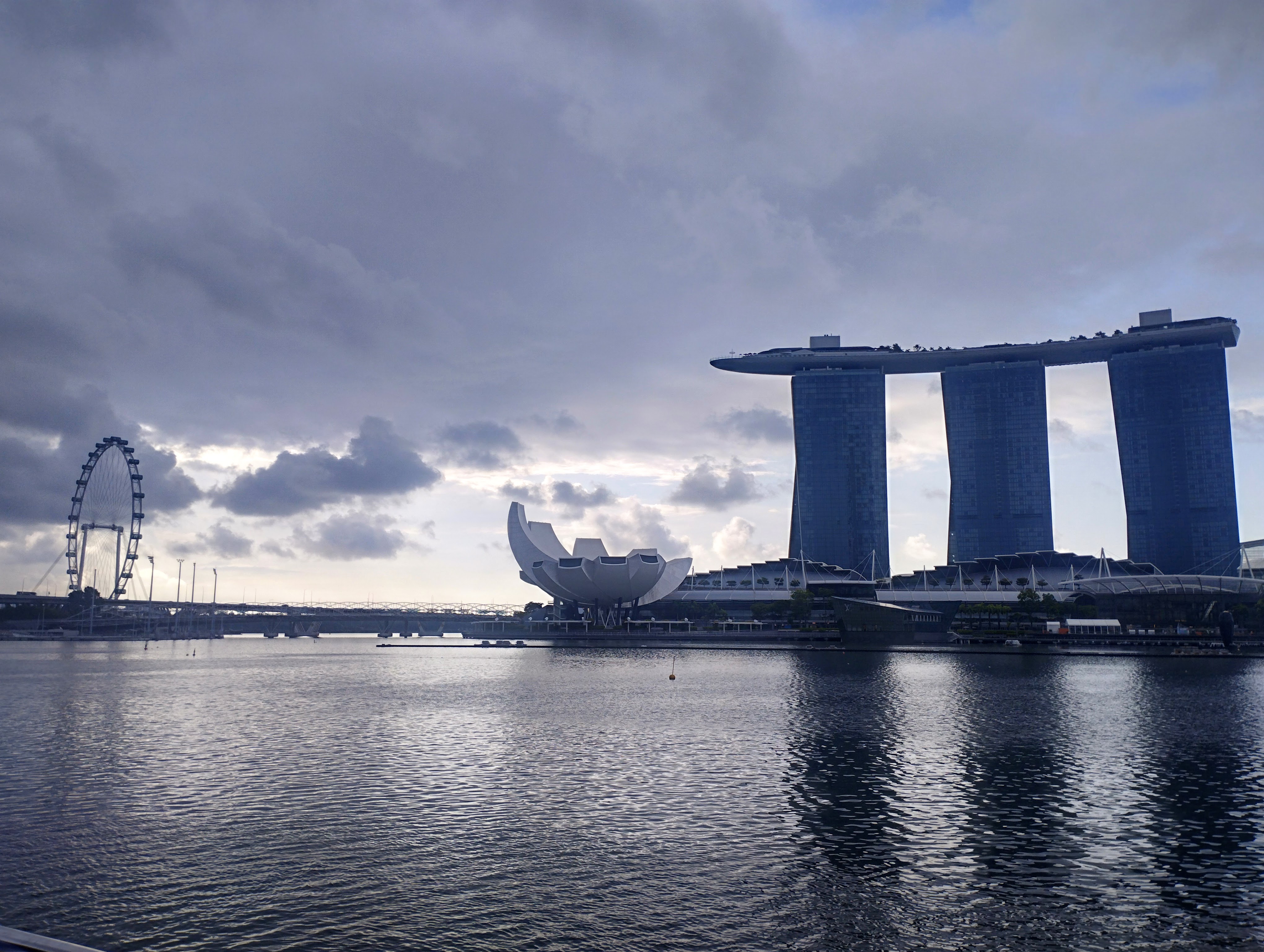 A scenic view of Singapore featuring the Marina Bay Sands hotel, the ArtScience Museum, and the Singapore Flyer in the background, with a cloudy sky reflected on the water.