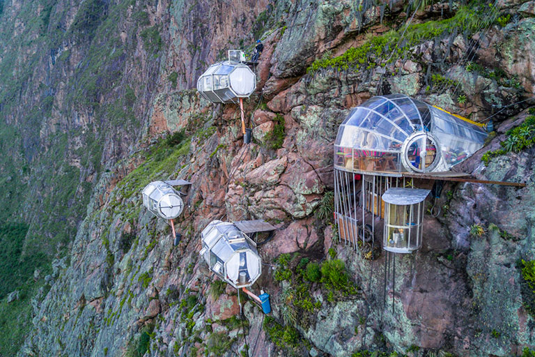 These transparent luxury capsules are bolted to a cliff side 400 meters above the Sacred Valley. To reach your bed, you need to hike a challenging trail. Alternatively, you can climb a vertical rock face via a via ferrata.