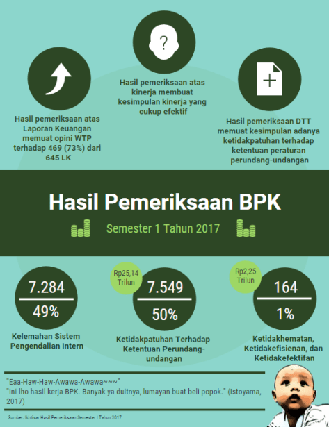 Rata-rata orang kita memang suka bingung kalau tidak ada wujudnya. Polisi dianggap nggak ada kalau nggak nangkap maling. Kan gitu. Maka, tanpa berlama-lama lagi, Istoyama siap memaparkan infografisnya yang disarikan dari Ikhtisar Hasil Pemeriksaan Semester I Tahun 2017.