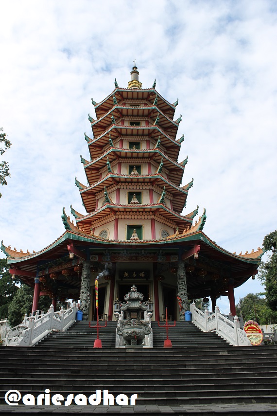 Terus berjalan ke selatan sambil disabet udara kencang tronton yang lewat ke arah Ungaran, saya akhirnya sampai juga di Pagoda yang dimaksud. Izin dulu sama satpam, nulis di buku tamu, dan memberikan duit seikhlasnya. Paling suka kalau sudah seikhlasnya gini. Kalau saya nggak ikhlas, nggak apa-apa dong?